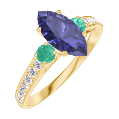 « L'ATELIER » NR 166586Pierścionek Żółte złoto 375 - Niebieski szafir Markiza 0.7 karat - Kamienie boczne Szmaragd - Oprawa Diament
