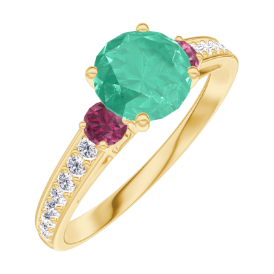 « L'ATELIER » Nº166646Pierścionek Żółte złoto 375 - Szmaragd okrągły 0.7 karat - Kamienie boczne Rubin - Oprawa Diament 4.9