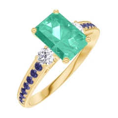 Pierścionek Żółte złoto 750 - Szmaragd Prostokąt 0.7 karat - Kamienie boczne Diament - Oprawa Niebieski szafir