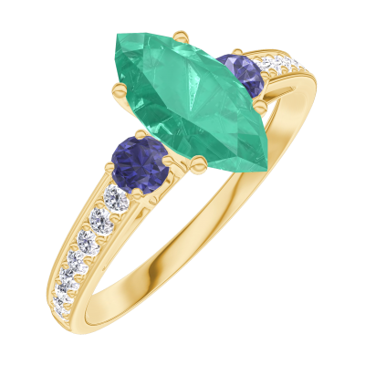 « L'ATELIER » Nº167166Pierścionek Żółte złoto 375 - Szmaragd Markiza 0.7 karat - Kamienie boczne Niebieski szafir - Oprawa Diament