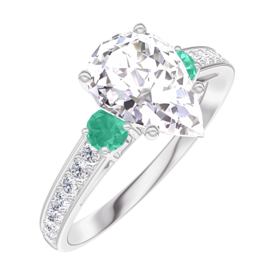 « L'ATELIER » Nº167687Pierścionek Białe złoto 750 - Diament Gruszka 1 karat - Kamienie boczne Szmaragd - Oprawa Diament