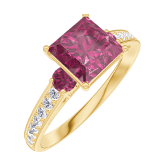 Pierścionek Żółte złoto 750 - Rubin „Księżniczka” 1 karat - Kamienie boczne Rubin - Oprawa Diament