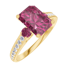 Pierścionek Żółte złoto 750 - Rubin Prostokąt 1 karat - Kamienie boczne Rubin - Oprawa Diament