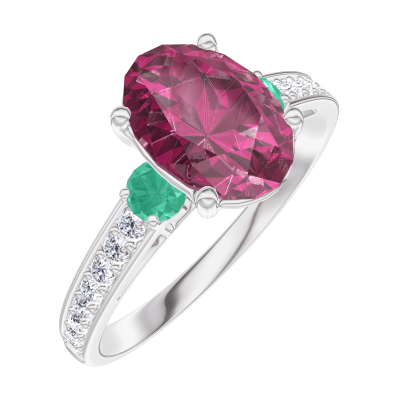 « L'ATELIER » Nº168187Pierścionek Białe złoto 750 - Rubin Owal 1 karat - Kamienie boczne Szmaragd - Oprawa Diament 4.7