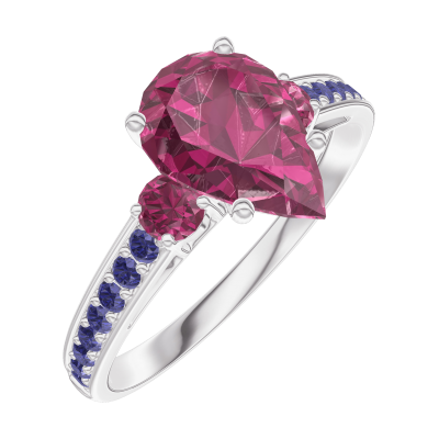 « L'ATELIER » Nº168256Pierścionek Białe złoto 375 - Rubin Gruszka 1 karat - Kamienie boczne Rubin - Oprawa Niebieski szafir
