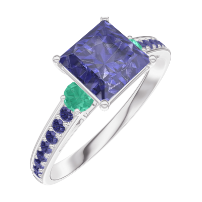 « L'ATELIER » NR 168596Pierścionek Białe złoto 375 - Niebieski szafir „Księżniczka” 1 karat - Kamienie boczne Szmaragd - Oprawa Niebieski szafir