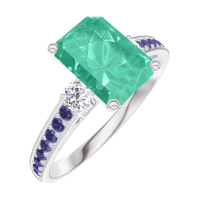 « L'ATELIER » NR 169236Pierścionek Białe złoto 375 - Szmaragd Prostokąt 1 karat - Kamienie boczne Diament - Oprawa Niebieski szafir 4.6
