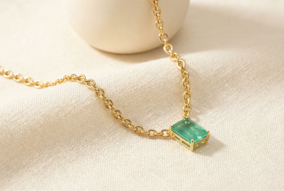 « L'ATELIER » NR 202273Naszyjnik Żółte złoto 750 - Szmaragd Prostokąt 0.3 karat - Łańcuszek Łańcuszek ankier
