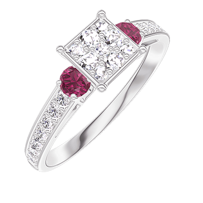 « L'ATELIER » NR 210348Pierścionek Białe złoto 375 - Klaster naturalnych diamentów „Księżniczka” odpowiednik 0.7 - Kamienie boczne Rubin - Oprawa Diament