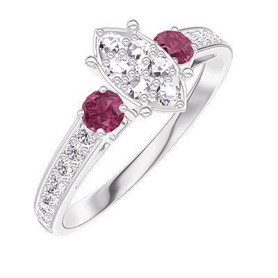 « L'ATELIER » Nº210748Pierścionek Białe złoto 375 - Klaster naturalnych diamentów Markiza odpowiednik 0.7 - Kamienie boczne Rubin - Oprawa Diament