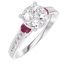 Pierścionek Białe złoto 750 - Klaster naturalnych diamentów okrągły odpowiednik 1 - Kamienie boczne Rubin - Oprawa Diament