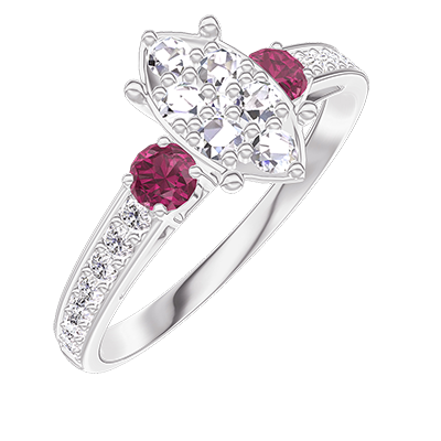 « L'ATELIER » Nº211348Pierścionek Białe złoto 375 - Klaster naturalnych diamentów Markiza odpowiednik 1 - Kamienie boczne Rubin - Oprawa Diament