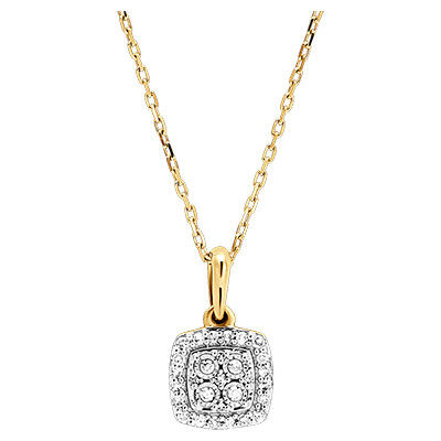 Blask zawieszki z kwadratowym diamentem otoczonym diamentową aureolą. Szlachetna i subtelna zawieszka z białego i żółtego złota emanująca ponadczasową elegancją.