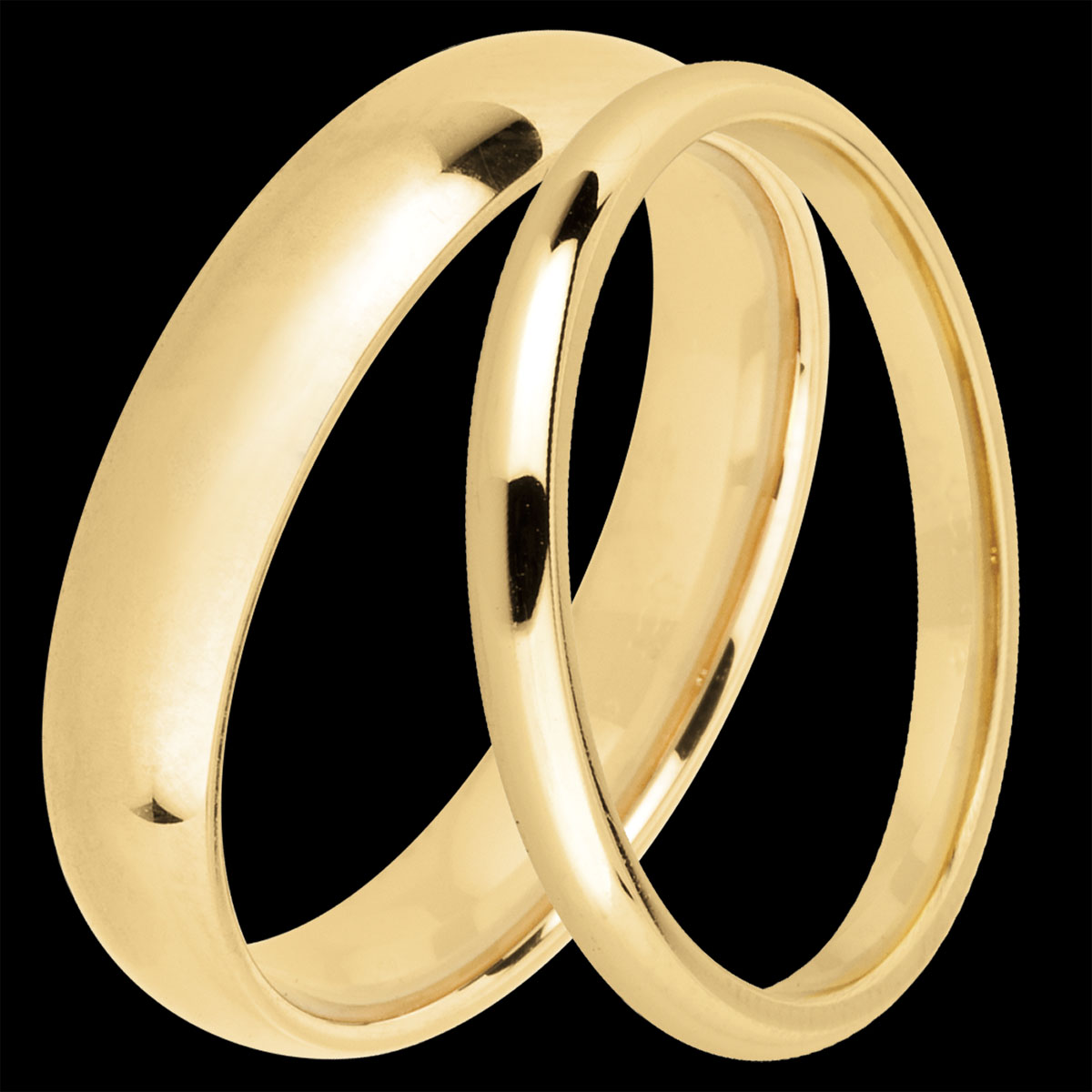 Elegancka para klasycznych obrączek ze złota żółtego: 2 mm szerokości dla niej, 4 mm dla niego. Symbol ponadczasowej miłości i wyrafinowanego stylu.