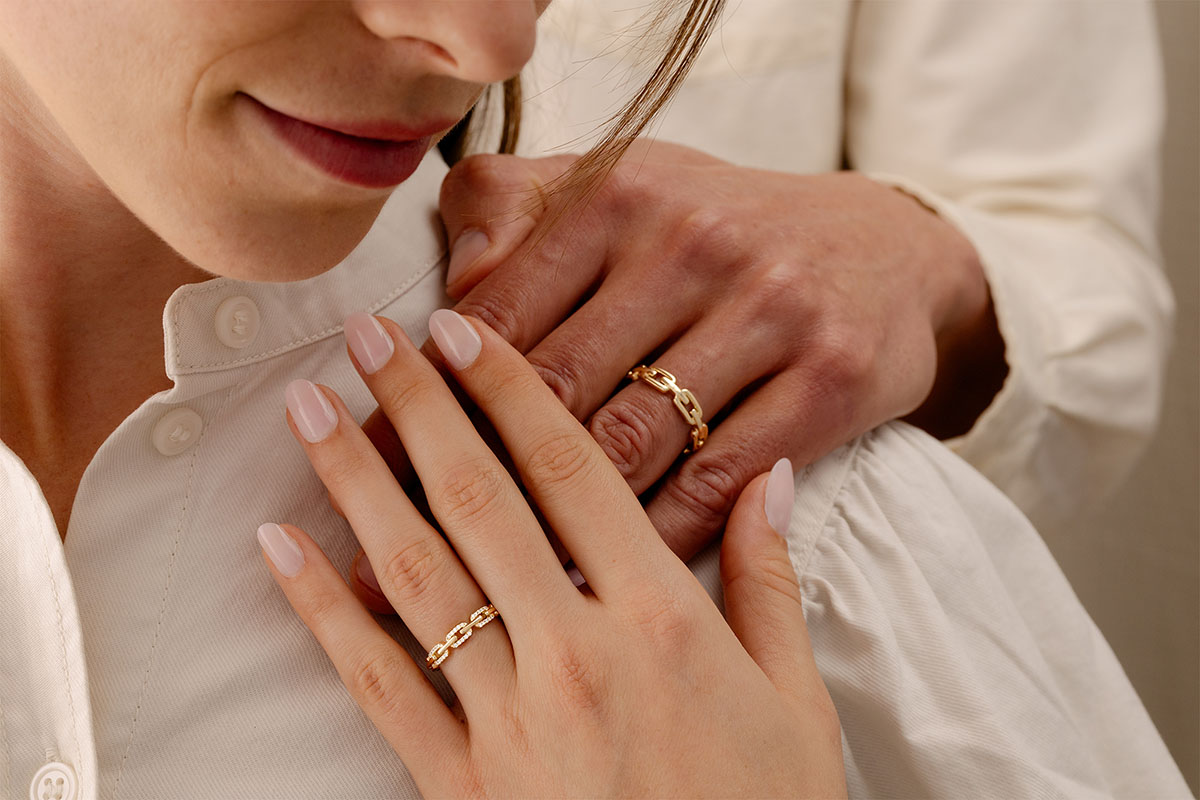 Duże kubańskie ogniwa wysadzane diamentami rozświetlają ten pierścionek z żółtego złota, nadając mu klasyczny charakter w nowoczesnej wersji.