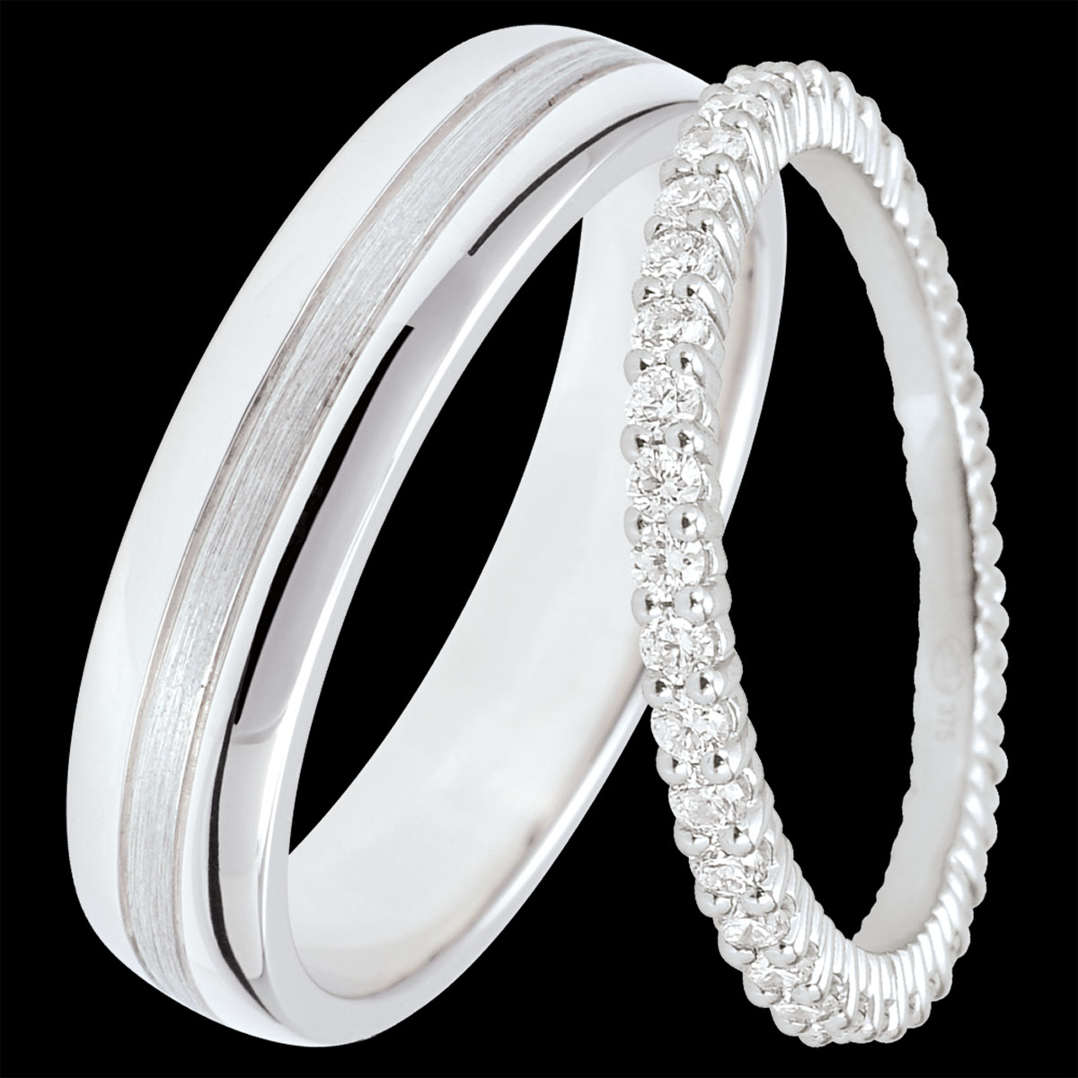 Elegancka para obrączek dla niej i dla niego. Jej obrączka w pełni wysadzana 38 diamentami o łącznej masie 0,57 ct. Jego obrączka z białego złota z matowym paskiem – klasyka z nowoczesnym akcentem.