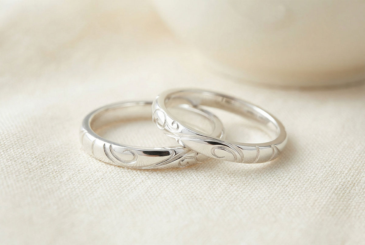 Elegancki duet obrączek, ozdobiony subtelnymi zawijasami i arabeskami ze złota. Wyjątkowy wybór dla ceniących wyrafinowaną estetykę i kunszt wykonania.
