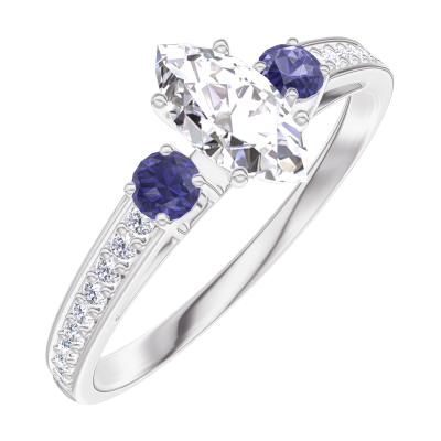 « L'ATELIER » NR 160568Pierścionek Białe złoto 375 - Diament Markiza 0.3 karat - Kamienie boczne Niebieski szafir - Oprawa Diament