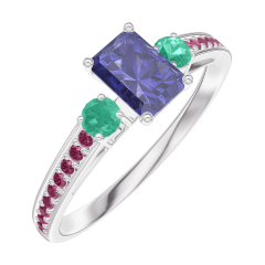 Pierścionek Białe złoto 750 - Niebieski szafir Prostokąt 0.3 karat - Kamienie boczne Szmaragd - Oprawa Rubin