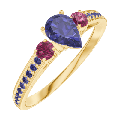« L'ATELIER » Nº161654Pierścionek Żółte złoto 375 - Niebieski szafir Gruszka 0.3 karat - Kamienie boczne Rubin - Oprawa Niebieski szafir