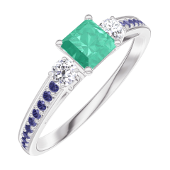 « L'ATELIER » NR 161936Pierścionek Białe złoto 375 - Szmaragd „Księżniczka” 0.3 karat - Kamienie boczne Diament - Oprawa Niebieski szafir