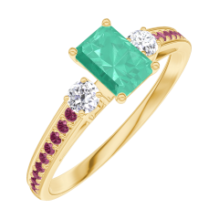 Pierścionek Żółte złoto 375 - Szmaragd Prostokąt 0.3 karat - Kamienie boczne Diament - Oprawa Rubin