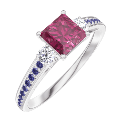 « L'ATELIER » Nº163136Pierścionek Białe złoto 375 - Rubin „Księżniczka” 0.5 karat - Kamienie boczne Diament - Oprawa Niebieski szafir