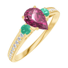 Pierścionek Żółte złoto 375 - Rubin Gruszka 0.5 karat - Kamienie boczne Szmaragd - Oprawa Diament