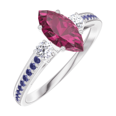 Pierścionek Białe złoto 375 - Rubin Markiza 0.5 karat - Kamienie boczne Diament - Oprawa Niebieski szafir