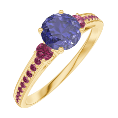 Pierścionek Żółte złoto 375 - Niebieski szafir okrągły 0.5 karat - Kamienie boczne Rubin - Oprawa Rubin