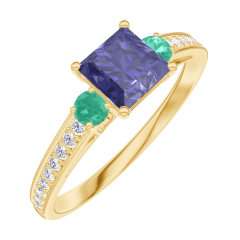 Pierścionek Żółte złoto 750 - Niebieski szafir „Księżniczka” 0.5 karat - Kamienie boczne Szmaragd - Oprawa Diament