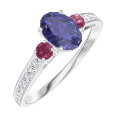Pierścionek Białe złoto 750 - Niebieski szafir Owal 0.5 karat - Kamienie boczne Rubin - Oprawa Diament