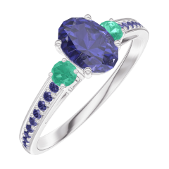 Pierścionek Białe złoto 750 - Niebieski szafir Owal 0.5 karat - Kamienie boczne Szmaragd - Oprawa Niebieski szafir