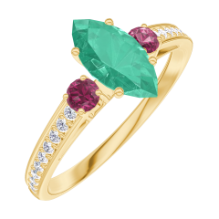 Pierścionek Żółte złoto 375 - Szmaragd Markiza 0.5 karat - Kamienie boczne Rubin - Oprawa Diament