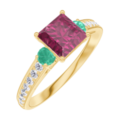 Pierścionek Żółte złoto 750 - Rubin „Księżniczka” 0.7 karat - Kamienie boczne Szmaragd - Oprawa Diament