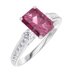 Pierścionek Białe złoto 375 - Rubin Prostokąt 0.7 karat - Kamienie boczne Diament - Oprawa Diament