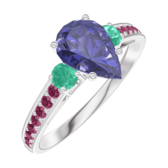Pierścionek Białe złoto 750 - Niebieski szafir Gruszka 0.7 karat - Kamienie boczne Szmaragd - Oprawa Rubin