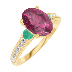 Pierścionek Żółte złoto 375 - Rubin Owal 1 karat - Kamienie boczne Szmaragd - Oprawa Diament