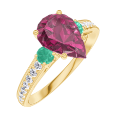 Pierścionek Żółte złoto 750 - Rubin Gruszka 1 karat - Kamienie boczne Szmaragd - Oprawa Diament