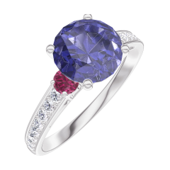 Pierścionek Białe złoto 375 - Niebieski szafir okrągły 1 karat - Kamienie boczne Rubin - Oprawa Diament