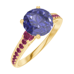 Pierścionek Żółte złoto 750 - Niebieski szafir okrągły 1 karat - Kamienie boczne Rubin - Oprawa Rubin