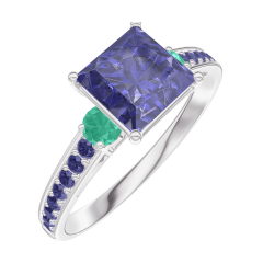 « L'ATELIER » NR 168595Pierścionek Białe złoto 750 - Niebieski szafir „Księżniczka” 1 karat - Kamienie boczne Szmaragd - Oprawa Niebieski szafir