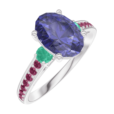 « L'ATELIER » NR 168791Pierścionek Białe złoto 750 - Niebieski szafir Owal 1 karat - Kamienie boczne Szmaragd - Oprawa Rubin 4.8
