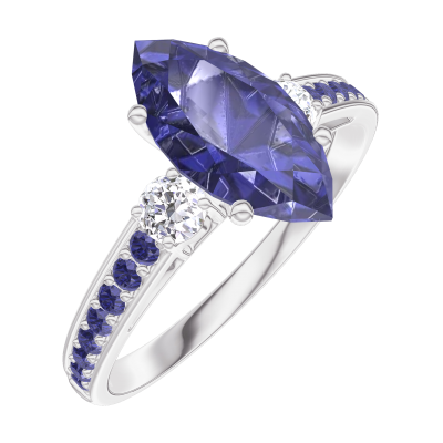 « L'ATELIER » NR 168936Pierścionek Białe złoto 375 - Niebieski szafir Markiza 1 karat - Kamienie boczne Diament - Oprawa Niebieski szafir
