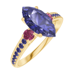 Pierścionek Żółte złoto 375 - Niebieski szafir Markiza 1 karat - Kamienie boczne Rubin - Oprawa Niebieski szafir