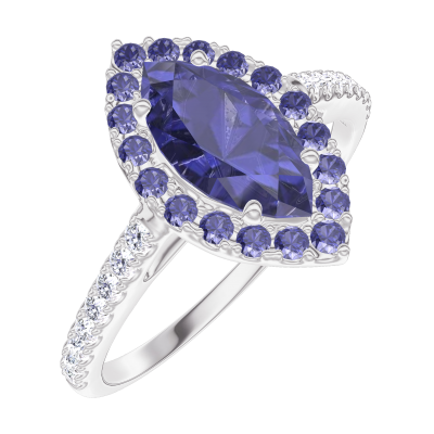 « L'ATELIER » NR 170856Pierścionek Białe złoto 375 - Niebieski szafir Markiza 0.5 karat - Korona z kamieni Niebieski szafir - Oprawa Diament