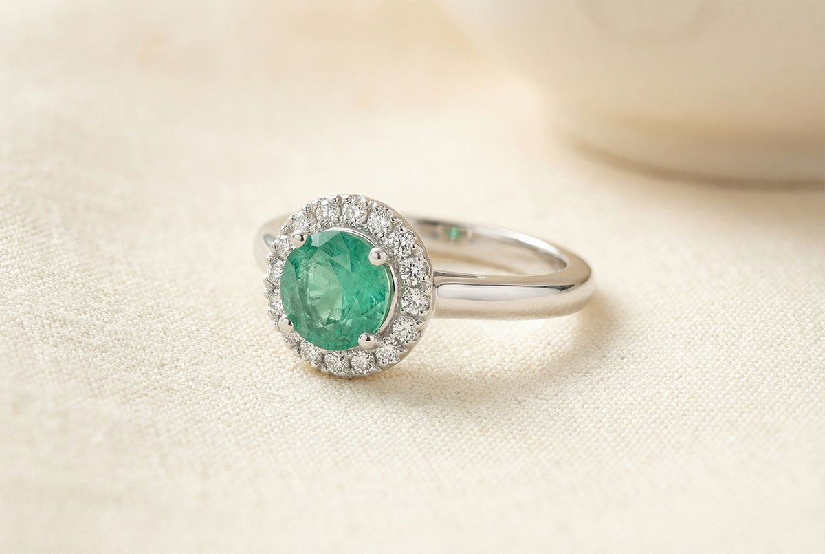 « L'ATELIER » NR 170868Pierścionek Białe złoto 375 - Szmaragd okrągły 0.5 karat - Korona z kamieni Diament 5