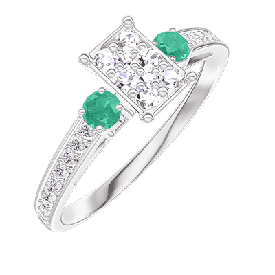 « L'ATELIER » NR 209887Pierścionek Białe złoto 750 - Klaster naturalnych diamentów Prostokąt odpowiednik 0.5 - Kamienie boczne Szmaragd - Oprawa Diament