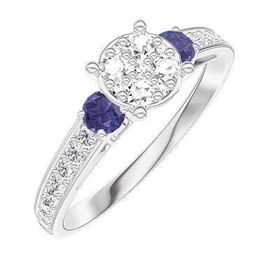 « L'ATELIER » NR 210268Pierścionek Białe złoto 375 - Klaster naturalnych diamentów okrągły odpowiednik 0.7 - Kamienie boczne Niebieski szafir - Oprawa Diament 5
