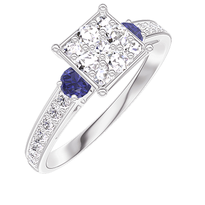 « L'ATELIER » NR 210968Pierścionek Białe złoto 375 - Klaster naturalnych diamentów „Księżniczka” odpowiednik 1 - Kamienie boczne Niebieski szafir - Oprawa Diament